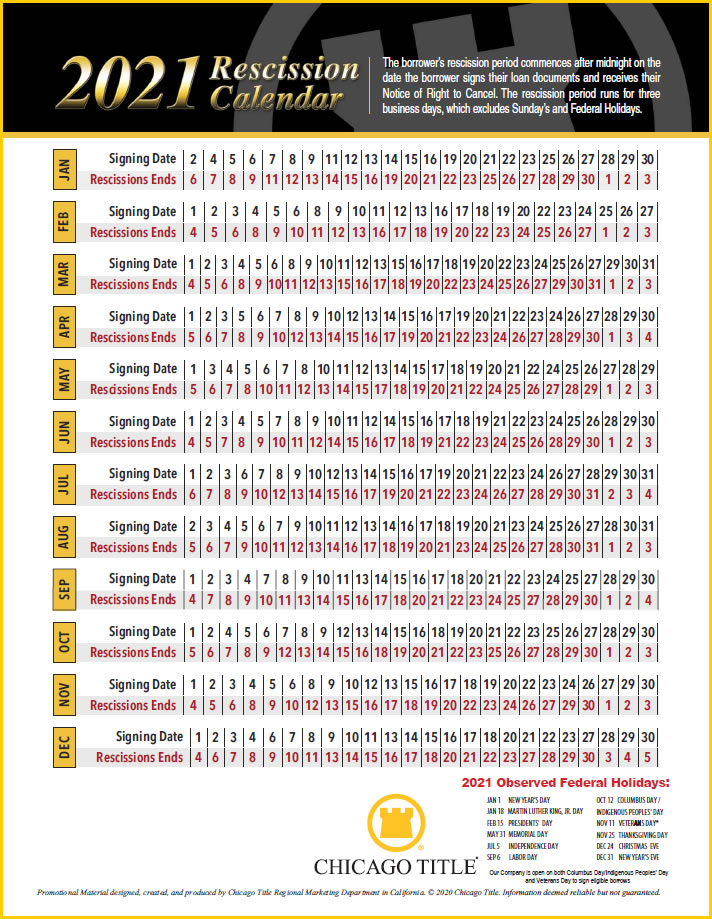 2021 Rescission Calendar Sundays and Federal holidays are excluded from the rescission period 112020 ORF-1253 2020 Old Republic Title Old Republic Title is providing this information as a free client service and makes no warranties or representations as to its accuracy. Rescission Ends 4 5 6 8 9 10 10 11 12 13 16 17 18 18 18 19 20 22 23 24 24 25 26 27 1 2 3 3 2021 Rescission Calendar Sundays and Federal holidays are excluded from the rescission period. If a fixed date holiday falls on a sunday christmas new year s day july 4th veterans day the monday following is skipped as a funding date and for rescission purposes.