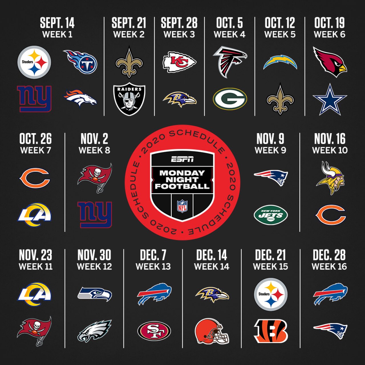 Nfl On Twitter The 2020 Monday Night Football Schedule By Visa 2020 Nfl Schedule Release Live Now On Nflnetwork