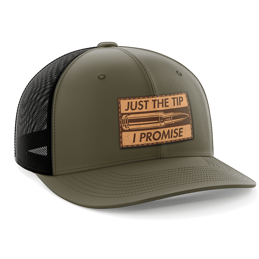 Just The Tip I Promise Leather Patch Hat. Just the Tip I Promise. New Just The Tip I Promise Trucker Hat Cap Bullet 2nd Amendment NRA Shirt Style.