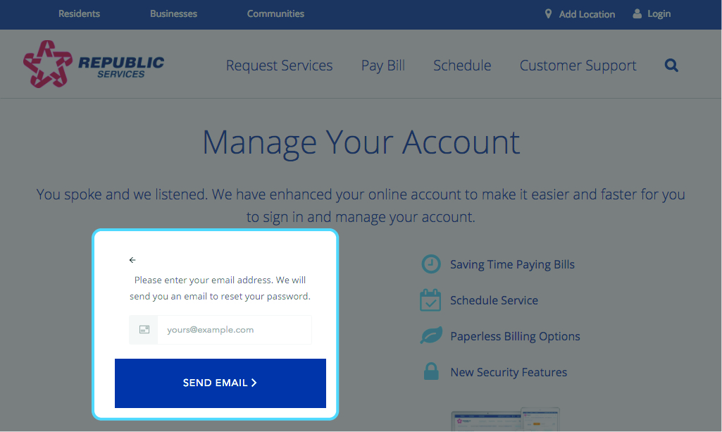 Learn how you can manage your recycling and waste needs with 247 access to your Republic Services account. With the Republic Services app you can access all of your account management features. If you cannot login please reset your passwordwith your.